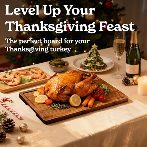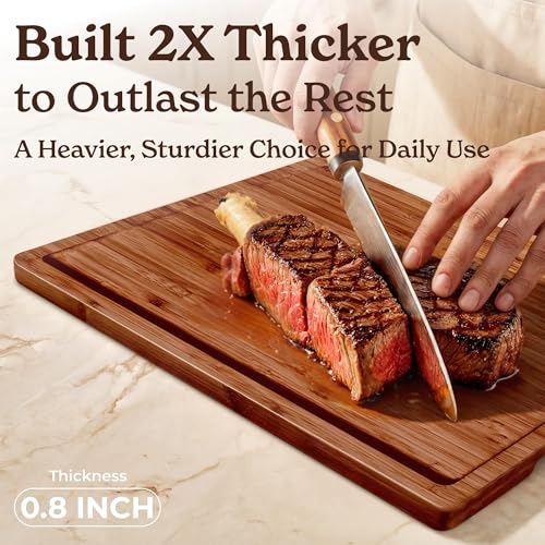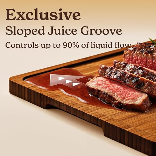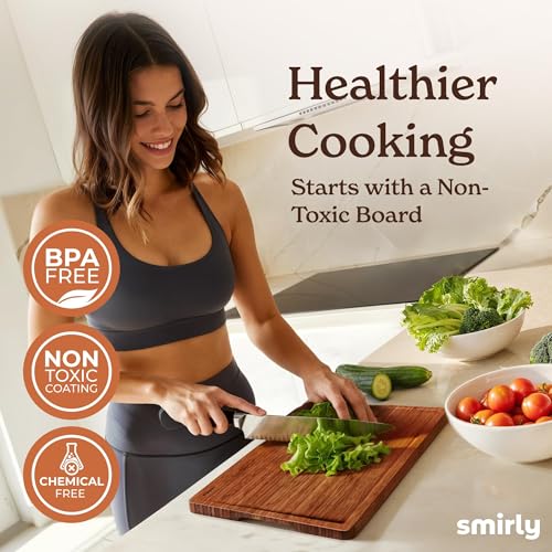 SMIRLY - سميرلي الواح تقطيع خشبية للمطبخ، مجموعة الواح تقطيع خشبية قابلة للعكس مع مقابض اخاديد عميقة للعصير، صينية تشاركوتيري كبيرة، اساسيات الشقة الجديدة، خيزران مكربن، 3 قطع مع حامل