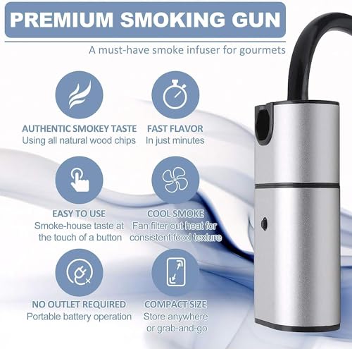 - مسدس مدخن للطعام صحي ومحدث: التدخين هو طريقة معالجة تستخدم الدخان الناتج عن الاحتراق غير الكامل للوقود لتدخين الطعام لزيادة الرائحة وتحسين جودة الطعام وإطالة العمر الافتراضي. باستخدام رقائق الخشب الحقيقية، ينتج مسدس الدخان هذا دخانًا باردًا لطعامك مثل: اللحوم والخضروات والجبن والكوكتيلات والسلمون والمشروبات دون تغيير قوامها أو درجات الحرارة.