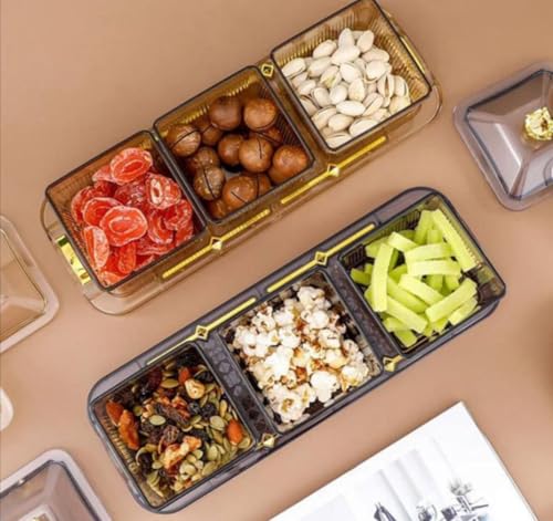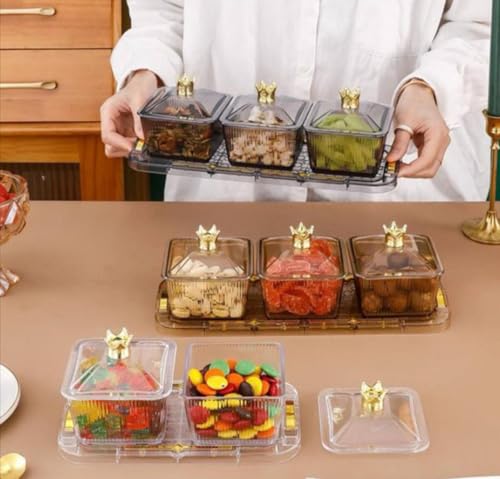 - مجموعة تقديم أنيقة: صينية تقديم مقسمة بثلاثة أقسام مع أغطية شفافة ومقابض تاج ذهبية مزخرفة، مثالية لتنظيم وتقديم الوجبات الخفيفة والمكسرات والحلوى والفواكه والمقبلات في الحفلات أو التجمعات