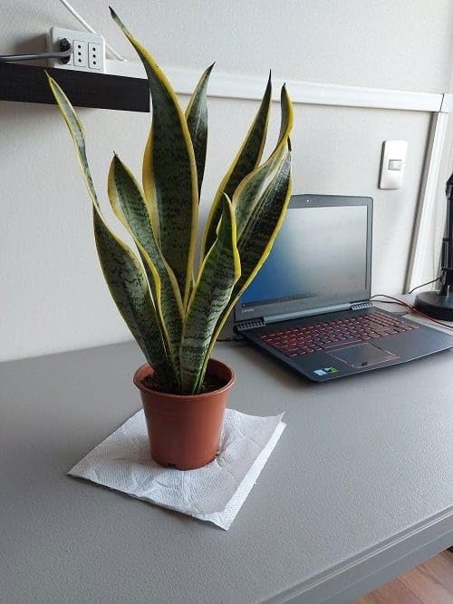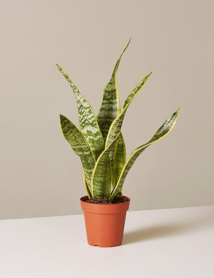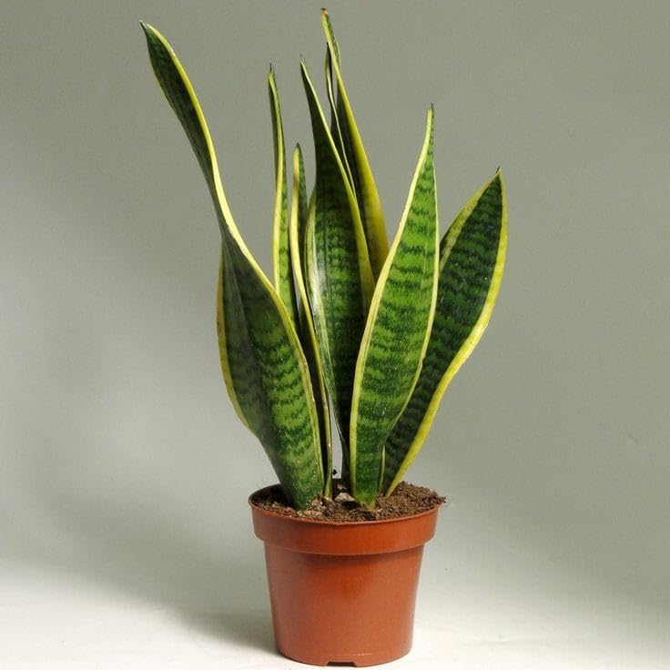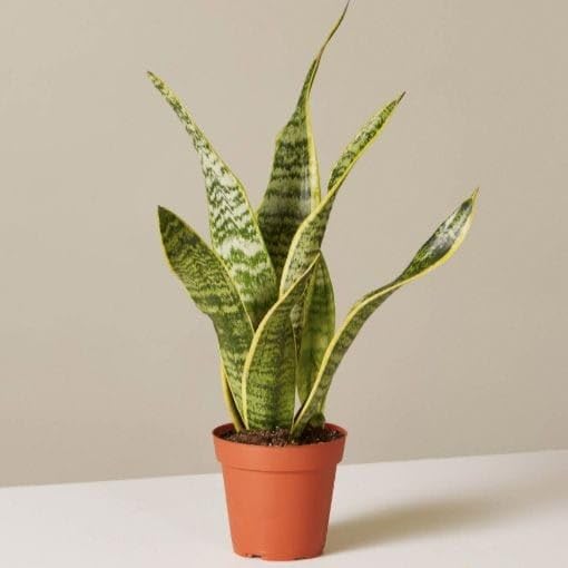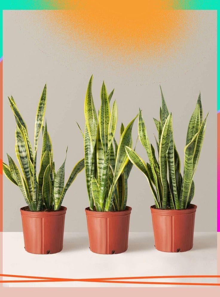 - مجموعة النباتات: تتضمن 3 نباتات ثعبان صحية (سانسيفيريا) في أواني تيراكوتا، كل منها يتميز بأوراق مخططة خضراء وصفراء مميزة
