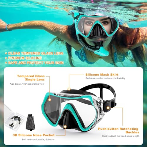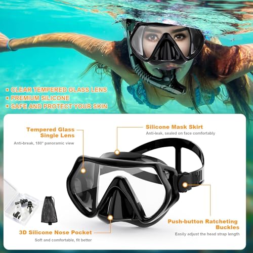 - 【مريح في الارتداء ومقاوم للماء】مقاس مريح يأتي من مادة السيليكون الناعمة التي تناسب الوجه بشكل مثالي دون أي فجوة للسماح بتسرب الماء. اضبط حزام الرأس إلى مكان مناسب، يتطابق القناع مع محيط الوجه بشكل جيد ويمكنه أيضًا إنشاء تأثير إغلاق جيد. جيب الأنف هو تصميم مناسب للمبتدئين لتجنب دخول الماء إلى الأنف عن طريق التنفس عن طريق الخطأ. يناسب بشكل مريح مع تنورة مانعة للتسرب لحماية عينيك من الماء.