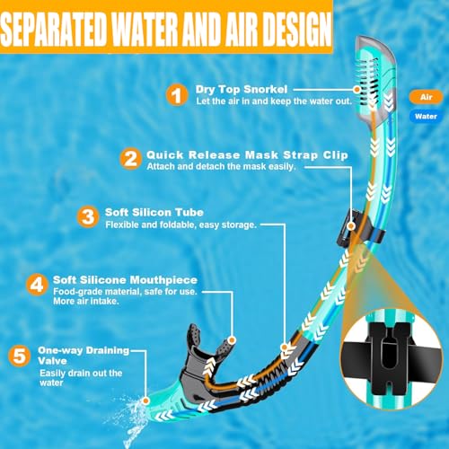 - 【مادة سيليكون آمنة غذائيًا】قطعة الفم والأنبوب الملولب لأنبوب التنفس وتنورة القناع مصنوعان من السيليكون الآمن غذائيًا، وهو أكثر صداقة للبيئة ولن يكون له رائحة غريبة، مما يضمن عدم الشعور بعدم الراحة عند ارتدائه لفترة طويلة.