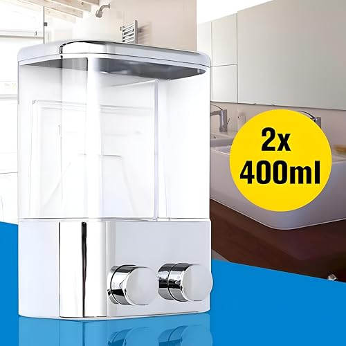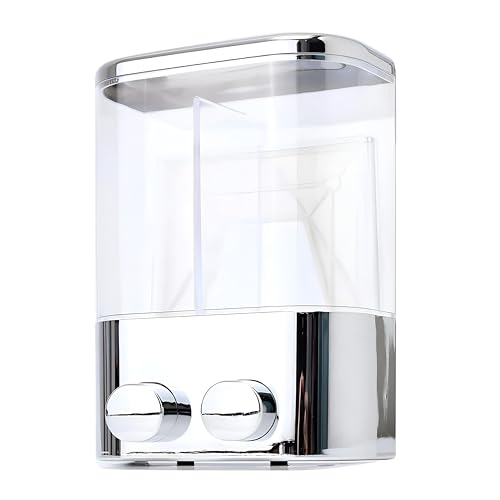 - Featuring two separate containers each with a generous one thousand milliliter capacity, this compact yet spacious dispenser is ideal for busy family bathrooms, hotels, or gym showers where ample storage is essential. The large volume ensures fewer refills are needed, providing convenience and efficiency for daily routines while the sleek white finish with silver accents adds a touch of modern visual appeal to any interior decor.