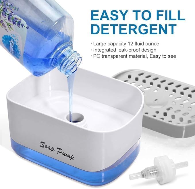 - تصميم موفر للمساحة 2 في 1 يجمع بين مضخة الصابون وصينية الإسفنج في منظم واحد صغير. وفر مساحة كبيرة حول حوض المطبخ مع الحفاظ على الصابون والإسفنجة في متناول اليد دائمًا.