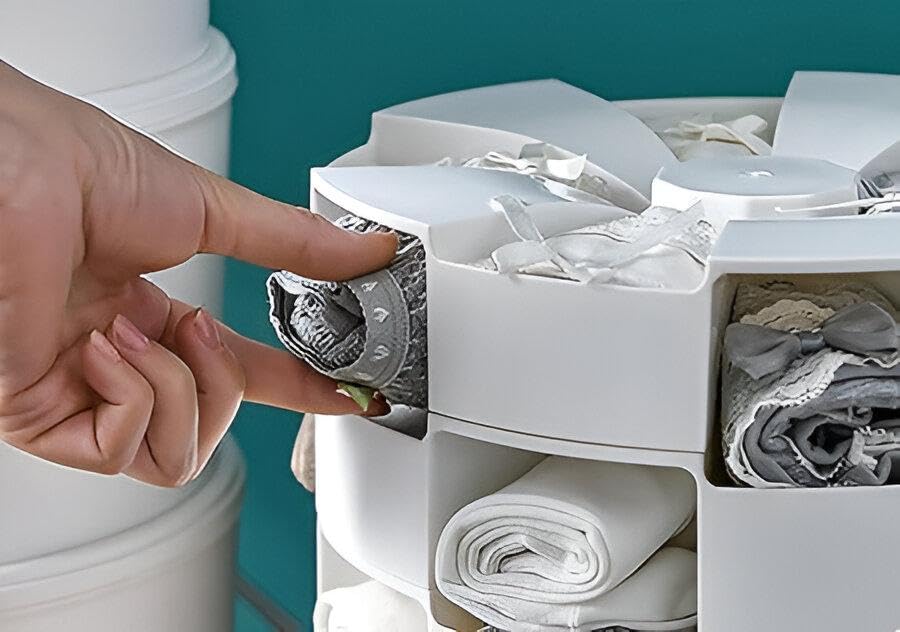 - تم تجهيز قاعدة المنظم بميزة الدوران، مما يوفر سهولة الوصول إلى جميع العناصر المخزنة بداخله. تتيح آلية الدوران هذه للمستخدمين العثور بسرعة على الجوارب أو الملابس الداخلية أو الملحقات واسترجاعها بأقل جهد.