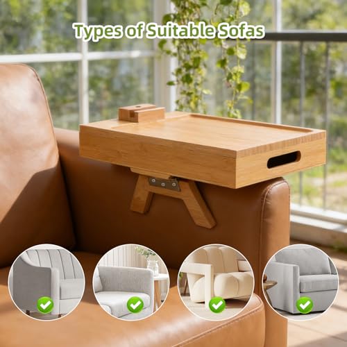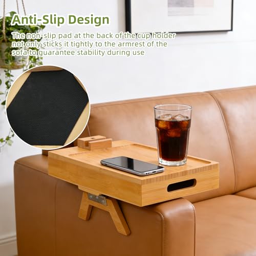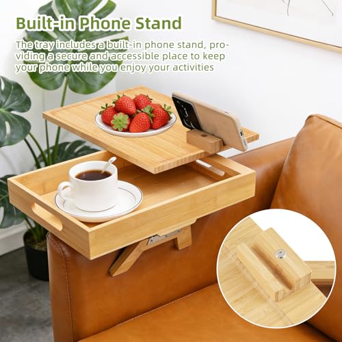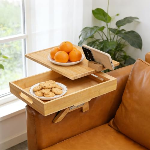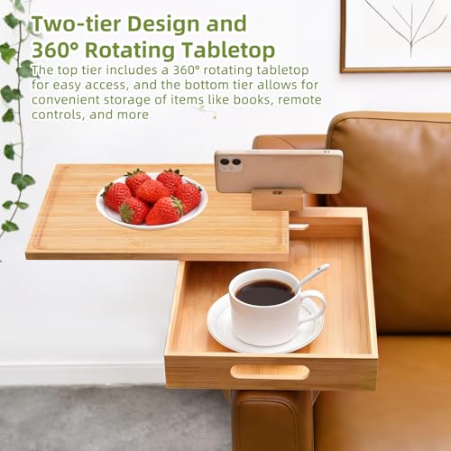 cupeohome - صينية ذراع الكنبة: طاولة ذراع كنبة من البامبو مكونة من طابقين ومضادة للانزلاق، مزودة بسطح دوار 360 درجة وحامل للموبايل. طاولة مربعة بنظام مشبك للتثبيت على ذراع الكنبة مخصصة للمشروبات والوجبات الخفيفة