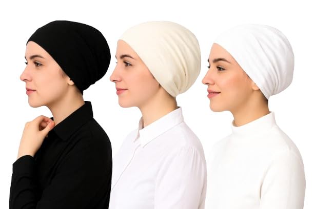 Generic - قبعات تحت الوشاح من القطن الناعم، اسود وابيض اوف وايت، غطاء راس قابل للتمدد وجيد التهوية، عبوة من 3 قطع