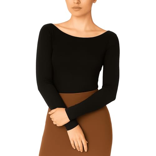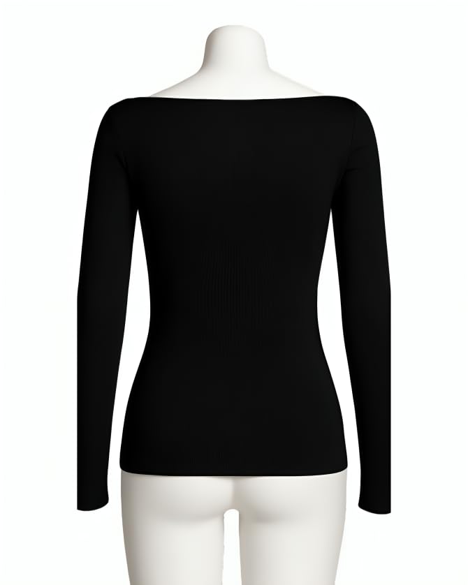 Generic - بلوزة مضلعة بأكمام طويلة وياقة واسعة للنساء من سوفت ستيبس، أسود