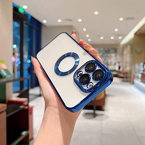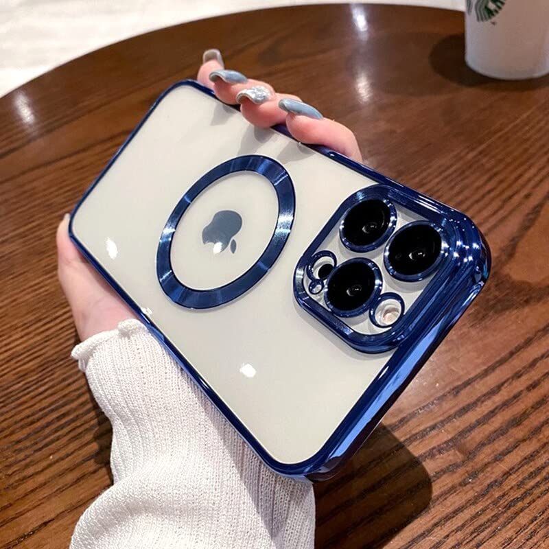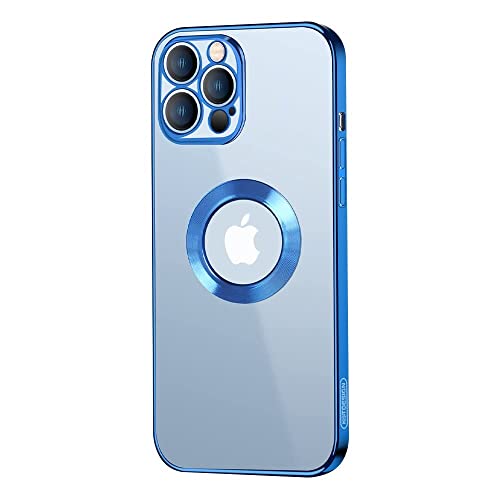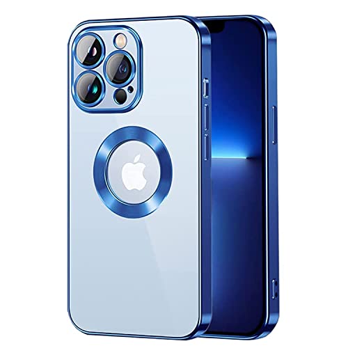 Generic - جراب موبايل خلفي شفاف ناعم من البولي يوريثين المقاوم للحرارة لموبايل ايفون 14 برو (6.1 بوصة) بفتحة شعار فاخرة مع حماية للعدسة باطار ذهبي (ازرق)، سيليكون