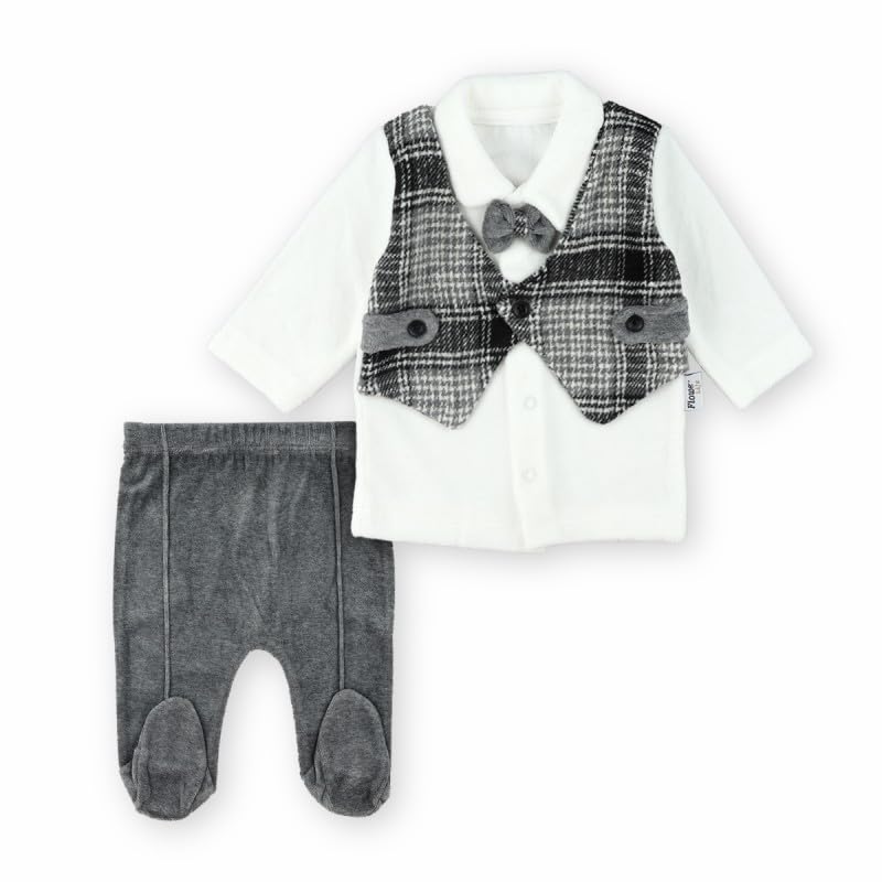 Generic - طقم قطيفة ناعم منقوش للاولاد البيبي باللونين الرمادي والابيض | 0-3 اشهر | فلاور لايف