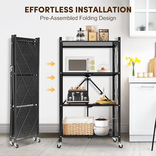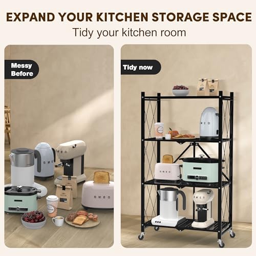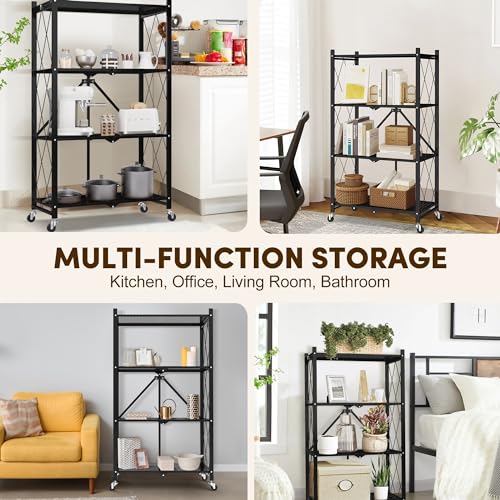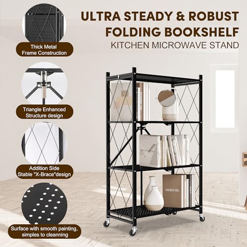 SohoTeco - رف خبازين للمطبخ من سوهوتيكو، رف ثابت قابل للطي، عربة شواء قابلة للطي، حامل ميكروويف مع عجلات، رف تخزين للمطبخ والمكتب وغرفة المعيشة والحمام وغرفة الكتب للاستخدام باللون الاسود من 4 طبقات