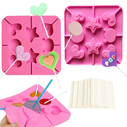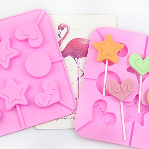 SOIDHSID - قالب مصاصات لولي بوب وشوكولاتة سيليكون بتصميم قلب ونجوم ودبدوب بشكل دائري مناسب لحلويات عيد الحب لصنع الكب كيك والمافن والجيلي مع 80 عصا مصاصة
