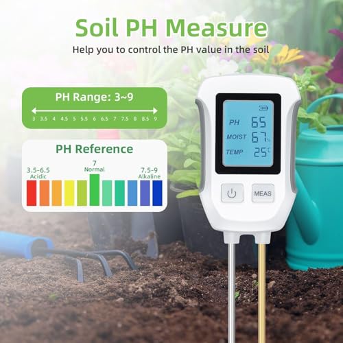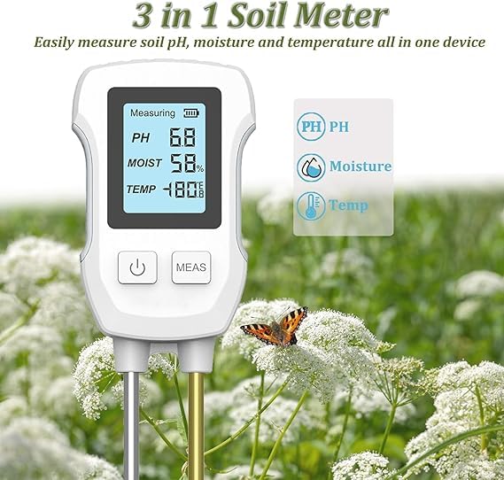 - شاشة LCD كبيرة بإضاءة خلفية: يحتوي جهاز اختبار التربة على شاشة LCD كبيرة مع إضاءة خلفية، حتى تتمكن من قراءة المعايير الرقمية ليلاً ونهارًا. يعمل الجهاز بثلاث بطاريات ايه ايه ايه (غير متضمنة).