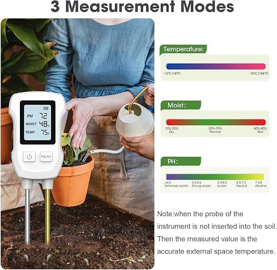 - جهاز اختبار التربة متعدد الوظائف: يقيس جهاز اختبار التربة الخاص بنا رطوبة التربة ودرجة الحموضة ودرجة الحرارة بسرعة، حتى تتمكن من العناية بنباتاتك وزهورك بشكل أفضل. من خلال قياس رطوبة التربة ودرجة الحموضة ودرجة الحرارة، يمكنك تحديد وقت ضبط رطوبة التربة ودرجة الحموضة.