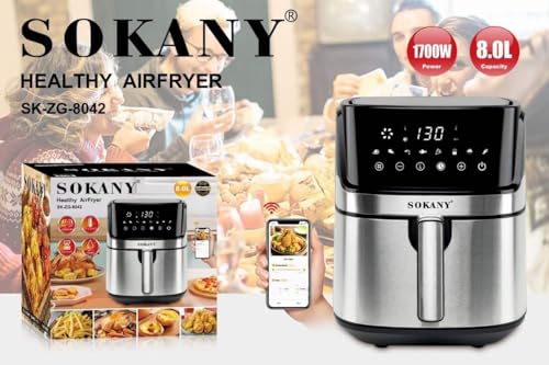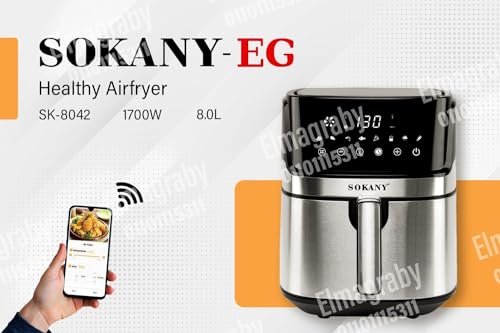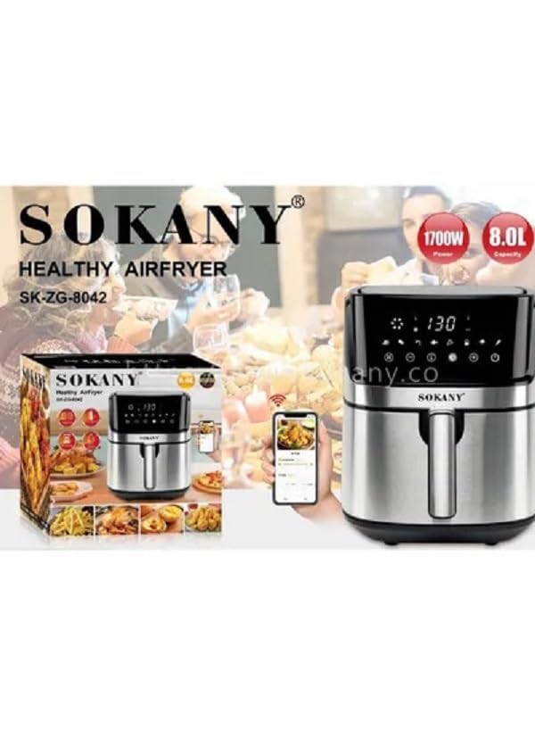 SOKANY - مقلاة هوائية سمارت اسينشيال 1700 وات وسعة 8 ليتر من سوكاني ، بلوتوث اللون فضي جهد امداد 220 فولت SK - 8042 واط