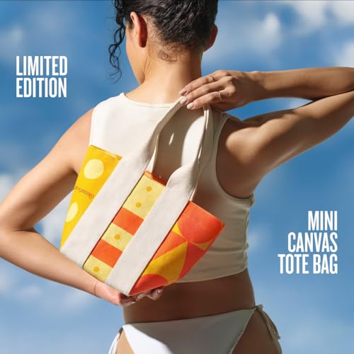 - مجموعة هدايا فاخرة: منتجات العناية الشخصية عالية الجودة في شنطة حمل أنيقة بتصميم صيفي باللونين البرتقالي والأصفر.