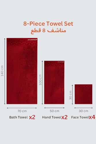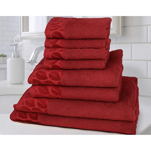 Sol Suave - مجموعة مناشف قطنية فاخرة من سول سواف، 8 قطع، جودة الفنادق، 2 منشفة حمام، 2 منشفة يد، 4 مناشف للوجه، فائقة النعومة والامتصاص، مع نمط اوراق الجاكار (احمر بارن، طقم مناشف من 8 قطع)