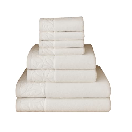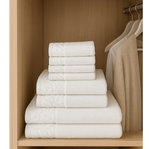 Sol Suave - مجموعة مناشف قطنية فاخرة من سول سواف، 8 قطع، جودة الفنادق، 2 منشفة حمام، 2 منشفة يد، 4 مناشف للوجه، فائقة النعومة والامتصاص، مع نمط اوراق الجاكار (ابيض، طقم مناشف من 8 قطع)