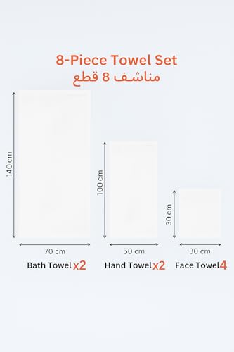- محتويات المجموعة الفاخرة: مجموعة مناشف كاملة مكونة من 8 قطع بما في ذلك منشفتي حمام (140 × 70 سم)، ومنشفتي يد (100 × 50 سم)، و4 مناشف وجه (30 × 30 سم)، مثالية للاستخدام اليومي أو إقامة الضيوف