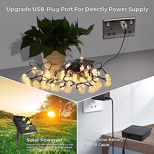 - خياران لإمداد الطاقة للاستخدام الداخلي والخارجي: توفر المصابيح الخيالية التي تعمل بالطاقة الشمسية خيارين لإمداد الطاقة، مما يجعلها بديلاً أفضل للأضواء الخيالية الشمسية الأخرى في السوق. بالإضافة إلى الطاقة الشمسية، يمكنك استخدام الهيكل الذي يعمل بمنفذ USB لتشغيل المصابيح باستخدام كابل. المصابيح الشمسية مجهزة ببطارية مدمجة قابلة لإعادة الشحن بسعة 1800 مللي أمبير في الساعة تعمل على إطالة وقت التشغيل.
