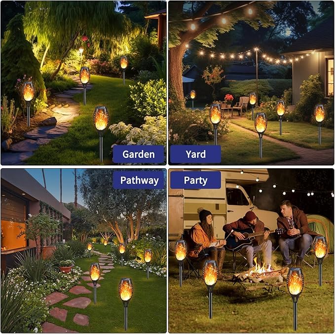 - استخدام واسع النطاق يعتبر هذا المصباح الشمسي خيارًا مثاليًا للمنزل والحديقة والفناء والممر وديكورات المناظر الطبيعية والحفلات والتخييم وحفلات الشواء وحفلات الزفاف والكريسماس ومهرجانات الهالووين، وهي قادرة على توفير نمط نار التخييم المثالي