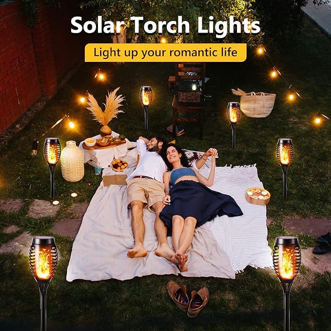 - تعمل بالطاقة الشمسية والإضاءة التلقائية: ببطارية عالية الأداء، تضيء مشاعل اللهب الشمسية 6-8 ساعات في الصيف و4-6 ساعات في الشتاء بعد شحنها بالطاقة الشمسية بالكامل. يحتوي على مفتاح تحكم حساس للضوء على اللوحة الشمسية، بحيث يمكن تشغيل/إيقاف التشغيل تلقائيًا بناءً على الضوء الخارجي.