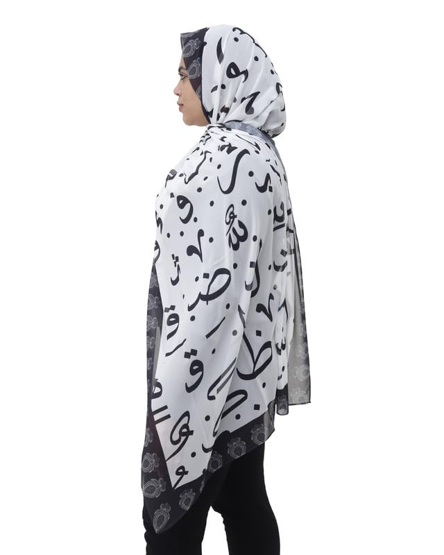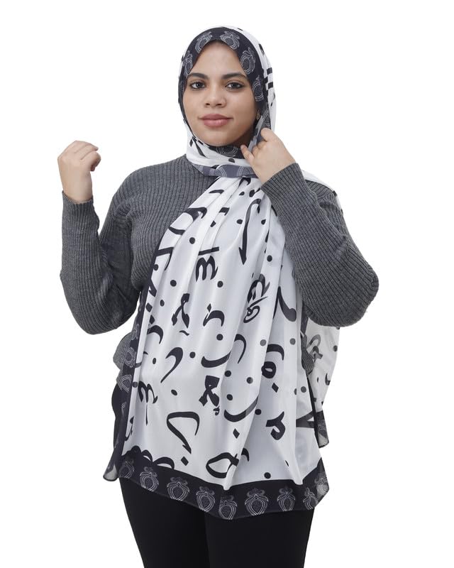 SOLY - سكارف حجاب خفيف الوزن من الشيفون الكريب مطبوع للنساء من سولي، مقاس 190 × 70 سم- أبيض وأسود