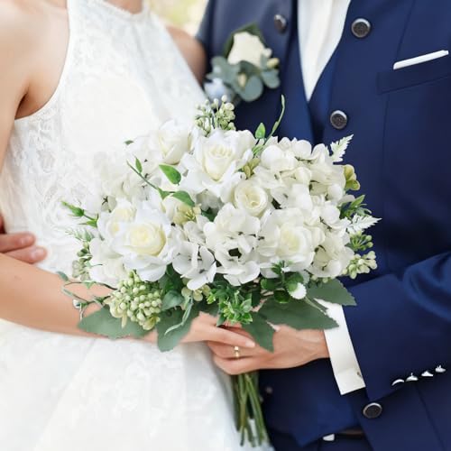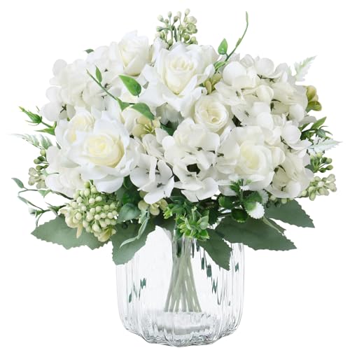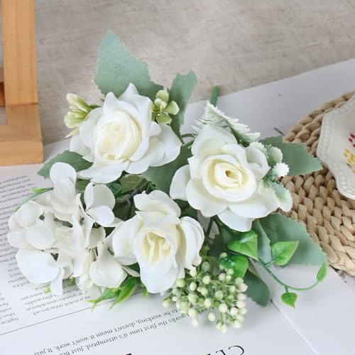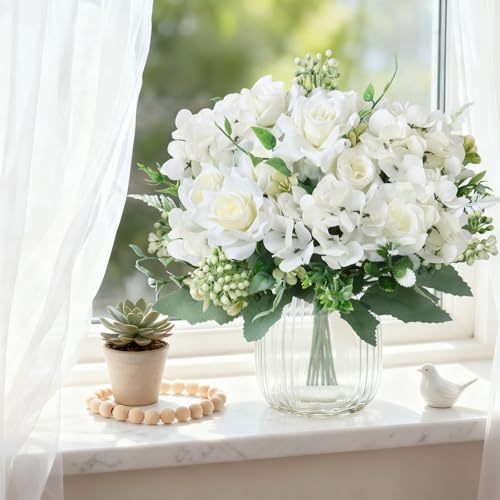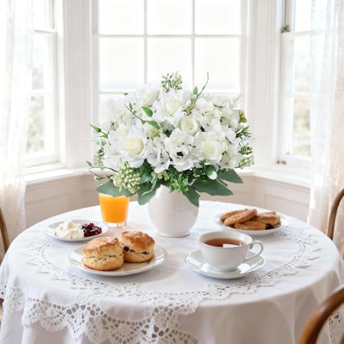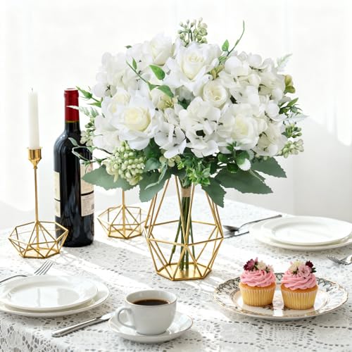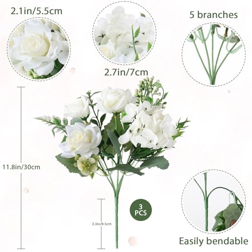 SOMYTING - زهور حرير ورد صناعي، باقة زهور وهمية من الورود الصناعية لقطع زينة وسطية لحفلات الزفاف وديكور حديقة المنزل من سوميتينج، 3 قطع (أبيض)