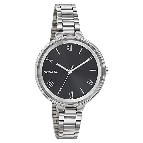 Sonata - ساعة يد بيزي بيز انالوج بعقارب من سوناتا، بمينا سوداء NL8159SM03، سلسلة لون فضي/ اسود - مناسبة للسيدات, اسود فضي