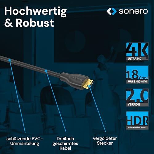 - مع كابل HDMI صغير عالي السرعة بدقة 4 كيه من سونيرو يمكن بسهولة الاتصال الشامل بالمصدر والحوض مع التوصيلات المطابقة. بفضل دعم 4 كيه، يتم نقل الصورة والصوت بشكل واضح ونظيف. يتم ضمان ذلك من خلال الصناعة عالية الجودة والتدريع المزدوج وطلاء بلاستيك PVC.