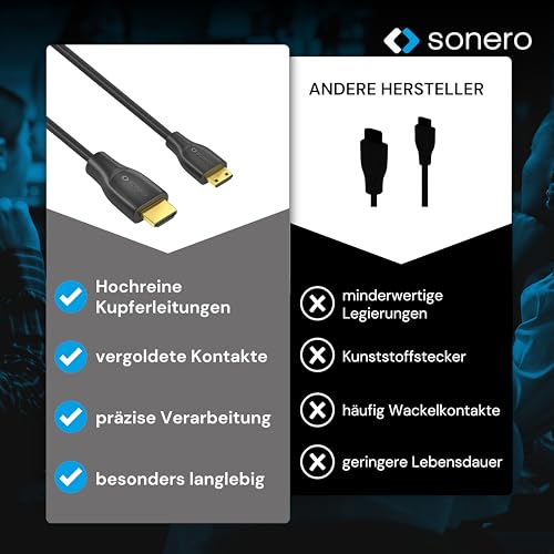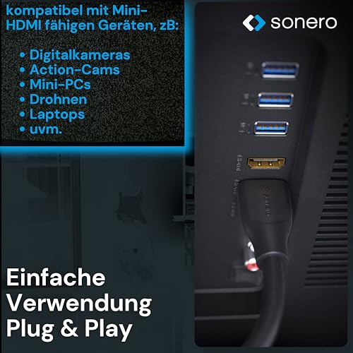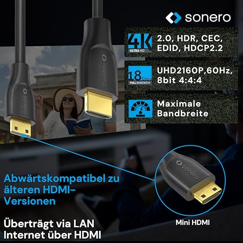 Sonero - سونيرو® كيبل ميني HDMI الى HDMI 4K، سرعة عالية ممتازة، 4K 60Hz، ميني HDMI ذكر الى HDMI ذكر، وصلات مطلية بالذهب، حماية مزدوجة، غلاف من بلاستيك PVC، 1.00 متر