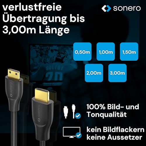 - يتوفر كابل سونيرو 4K Mini HDMI بأطوال تتراوح من 0.50 متر إلى 3.00 متر، بحيث يتم تضمين الطول المناسب لكل استخدام تقريبًا.