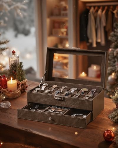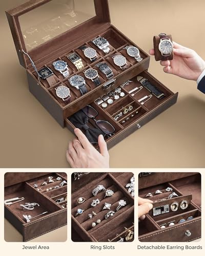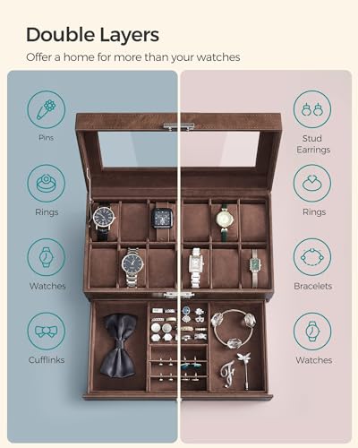 - [طبقتان، سعة كبيرة] توفر الطبقة العلوية ذات 12 فتحة منزلًا مريحًا لساعاتك بحجم مينا يصل إلى 48 ملم، كما يوفر الدرج السفلي بمساحات مختلفة مساحة إضافية للسلاسل والخواتم والحلقان وغيرها الكثير