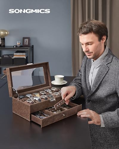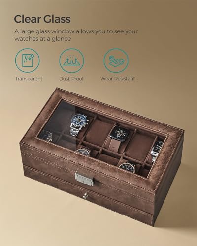 SONGMICS - هيكل ساعة بـ 12 فتحة، هيكل ساعة قابل للقفل مع غطاء زجاجي، طبقتين، جلد صناعي بني، بطانة بنية UJWB012K01 من سونج مايكس