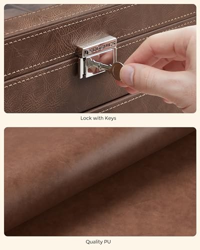- [صناعة متقنة] هذا الهيكل مصنوع من جلد صناعي عالي الجودة وبطانة قطيفة ناعمة، كما يتميز بخياطة أنيقة وقفل عالي الجودة (يتضمن مفتاحين). منظم علبة الساعات المصنوع جيدًا هذا قوي ومتين، مما يحافظ على مقتنياتك الثمينة آمنة ومأمونة