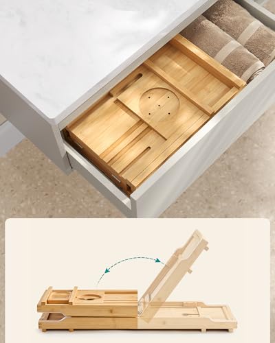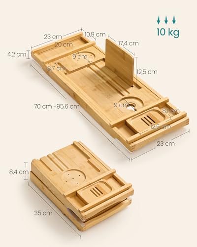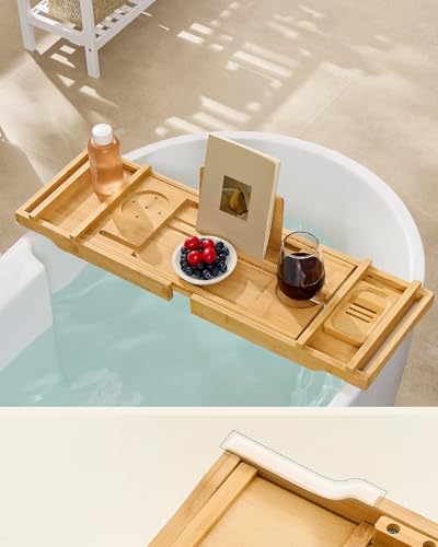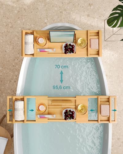 SONGMICS - صينية حمام من الخيزران قابلة للتمديد بعرض 70 - 95.6 سم، صينية حوض استحمام قابلة للطي، صينية حوض استحمام غير قابلة للانزلاق مع حامل أكواب وحامل تابلت وكتب وحوامل فوط من سونج مايكس، بيج طبيعي BCB072N01