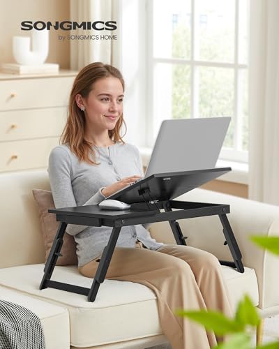 SONGMICS - سونج مايكس مكتب لابتوب للسرير قابل للطي للابتوب حتى 15.6 انش، زاوية وارتفاع قابلين للتعديل، محمول للعمل والقراءة والكتابة والافطار، ارجل خيزران ودرج، اسود داكن ULLD105BE01