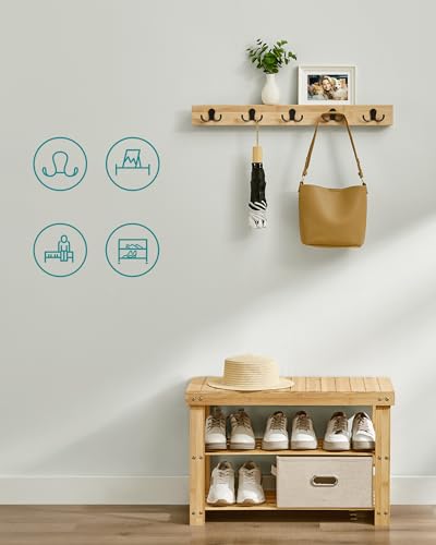 SONGMICS - مجموعة رف معاطف يثبت على الحائط، رف أحذية مع مقعد من سونج مايكس، متعدد الوظائف، 5 خطافات معدنية مزدوجة، مقعد أحذية مع 3 مستويات مصنوع من البامبو، للطرقة وغرفة النوم وغرفة المعيشة، بيج طبيعي LCR004N01