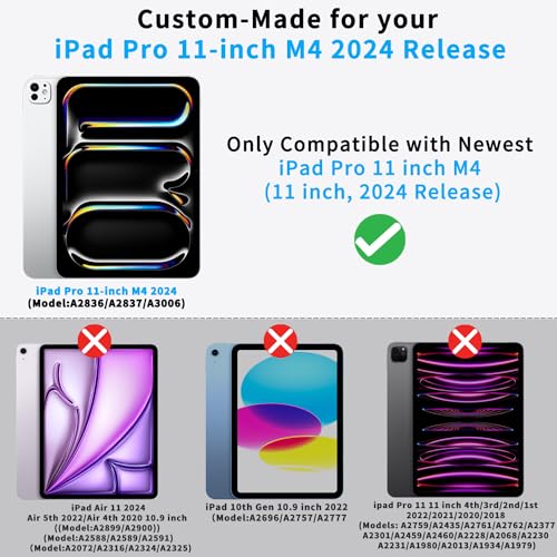 - 【متوافق مع اي باد برو 11 بوصة 2024】يتوافق جراب اي باد برو هذا فقط مع اي باد برو 11 بوصة 2024 M4 الجيل الخامس (الموديل: A2836/ A2837/ A3006). غير متوافق مع أي موديلات أخرى، يُرجى التحقق من الجزء السفلي الخلفي لجهاز اي باد لمعرفة رقم الموديل قبل الطلب.