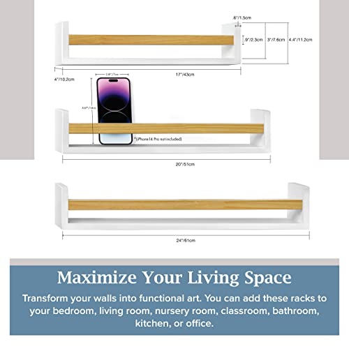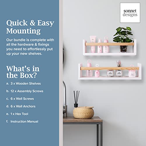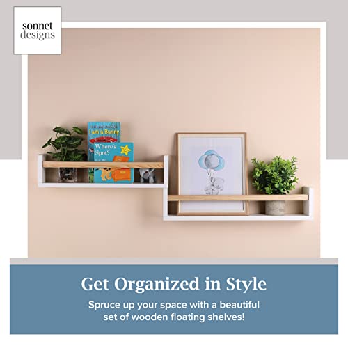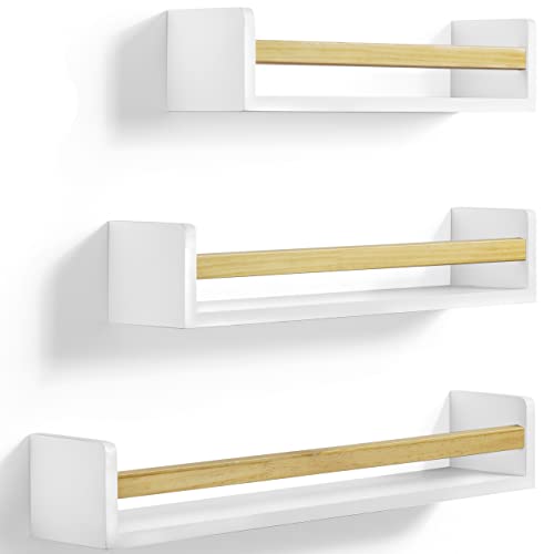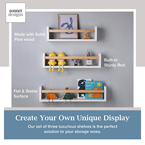 Sonnet Designs - رف كتب عائم مكون من 3 قطع بلون ابيض مع قضيب بني لديكور الحضانة، ارفف كتب تثبت على الحائط لغرفة الاطفال والعاب الاطفال الصغار مقاس 24 انش قابلة للاستخدام في المنزل والمطبخ والحمام وحافة