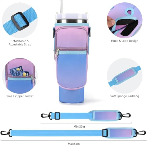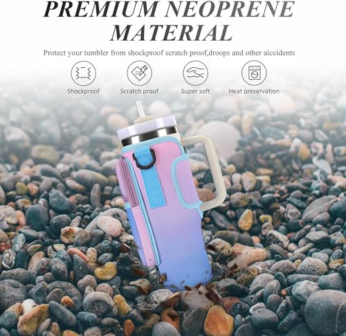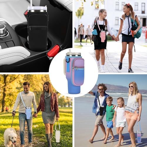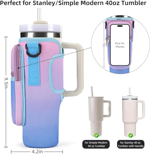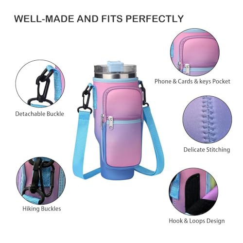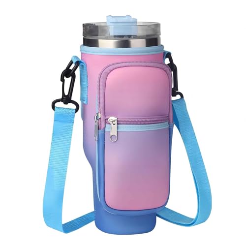 SOOFAM - شنطة حمل زجاجة المياه مع جيب للموبايل لكوب ستانلي سعة 1.14 لتر مع مقبض من سوفام، شنطة حامل زجاجة المياه مع غطاء وحزام كتف قابل للتعديل للمشي لمسافات طويلة والسفر والتخييم (لون متدرج)