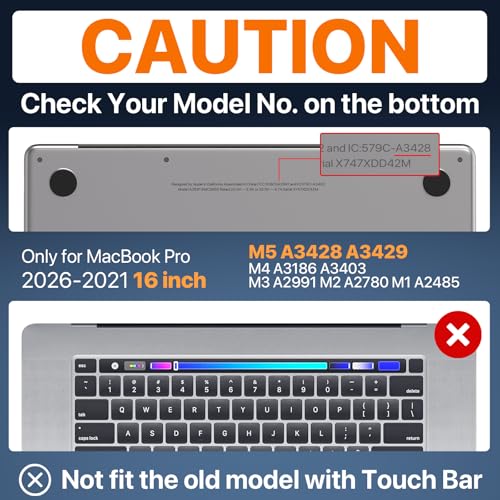 - تحقق من رقم الموديل الخاص بك. متوافق فقط مع ماك بوك برو 16 انش إصدار 2025-2021 مع شريحة M4 M3 M2 M1 برو/ماكس (الموديلات: A3186/A3403/A2991/A2780/A2485). لا يناسب الطراز القديم في عام 2019؛ لا يناسب A2141، يرجى التحقق من رقم الموديل الموجود في الجزء السفلي من جهاز ماك بوك قبل الشراء.