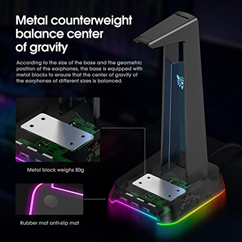 SOSISU - حامل سماعات راس RGB مع AUX 3.5 ملم و3 منافذ USB 2.0، حامل سماعة راس للالعاب مع قاعدة مطاطية مضادة للانزلاق لسماعات العاب سوسيو (غير متضمنة)، الكمبيوتر المكتبي (اسود)، ممحاة معدن