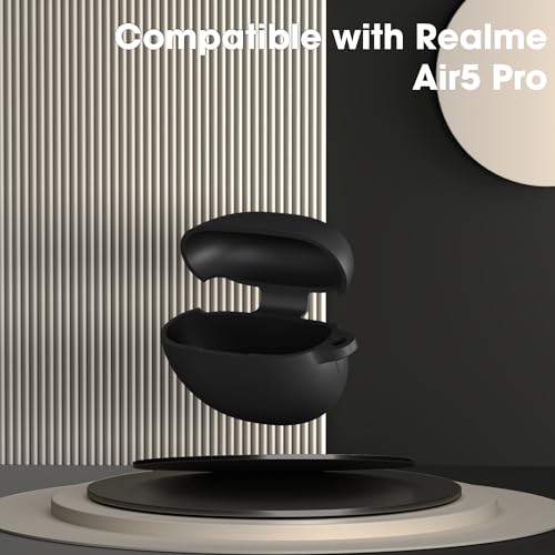 Sounce - جراب سيليكون لسماعات ريلمي بادز اير 5 برو من ساونس قبضة محمولة غير قابلة للانزلاق وواقي مقاوم للخدش مع مشبك حلقة تثبيت حماية كاملة للماء والصدمات - أسود