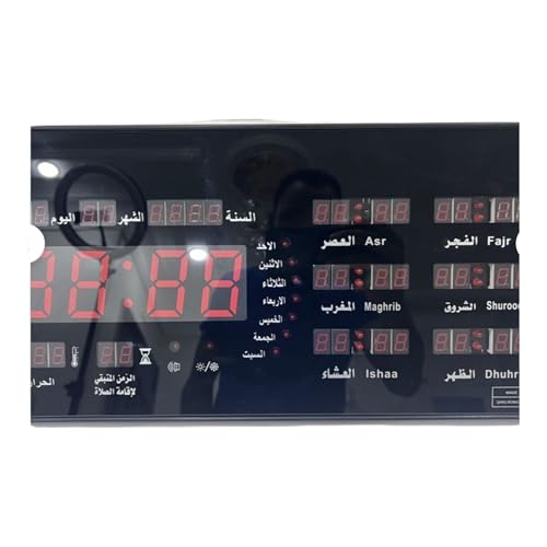 - العرض: شاشة LED واضحة تعرض الوقت الحالي ووقت الصلاة القادمة بتنسيق 24 ساعة و12ساعة