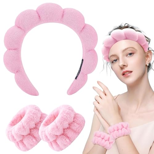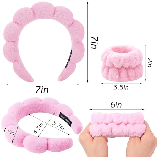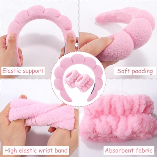 Style Keepers - طوق رأس اسفنجي للسبا للنساء والبنات، تصميم لطيف للمكياج والعناية بالبشرة، مع مجموعة أساور معصم لغسل الوجه وتجفيف الوجه، شريط رأس منفوخ وناعم للشتاء، اكسسوار شعر سميك غير قابل للانزلاق، بلون وردي، 1