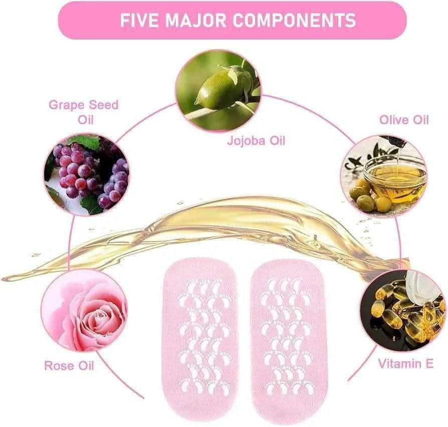 - تركيبة فريدة: جوارب السبا الطبية تحتوي على خمسة مكونات رئيسية (زيت بذور العنب، زيت الجوجوبا، زيت الزيتون، زيت الورد، وفيتامين هـ) لترطيب البشرة بعمق