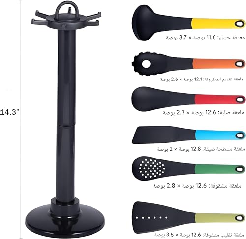 - تتضمن مجموعة أدوات المطبخ المصنوعة من السيليكون ستة أدوات أساسية: ملعقة تقليب مرنة (32.5 × 5 سم)، ملعقة تقليب مشقوقة (32 × 9 سم)، ملعقة صلبة (32 × 7 سم)، ملعقة مشقوقة (32 × 7 سم)، مغرفة حساء (29 × 9 سم)، ومكرونة (30 × 6.5 سم)، جميعها مخزنة بشكل مريح في حامل دوار (36 × 13 سم). كل أداة بحجم مدروس للاستخدام اليومي العملي ومصممة لتناسب مجموعة واسعة من استخدامات الطهي، من القلي إلى التحريك والتقديم.