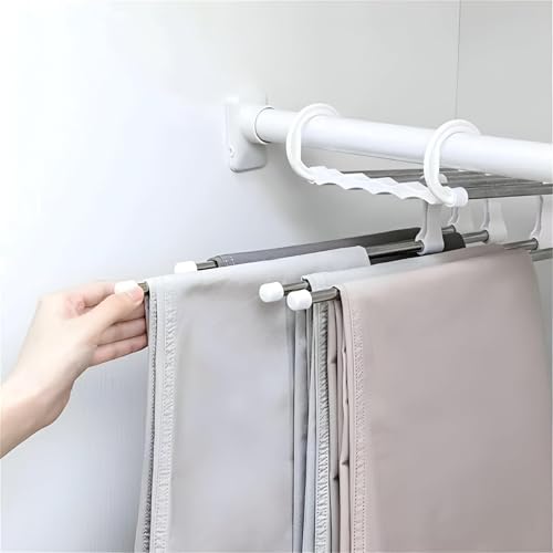 - يمكن تعديل قضبان الفولاذ المقاوم للصدأ الخمسة بشكل مستقل، حيث تنزلق بسلاسة بين 34 سم و 48 سم لاستيعاب أطوال وأنماط مختلفة من البناطيل، مما يضمن إمكانية تعليق كل قطعة ملابس واستعادتها دون إزعاج القطع الأخرى.