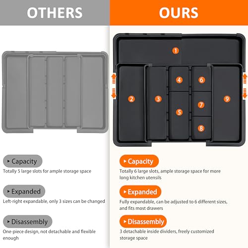 - يتميز بسعة كبيرة للغاية: يتضمن منظم أدوات المائدة 3 مساحات تخزين في المنتصف و3 طبقات قابلة للتوسيع. مساحات التخزين القابلة للتوسيع رائعة ليس فقط لتخزين أواني الطهي الكبيرة مثل ملعقة سباتولا ومساكة طعام والمغرفة، ولكن لأدوات المائدة الصغيرة وأدوات المائدة الفضية، مثل الشوك والمعالق والسكاكين. زد سعة التخزين لأدراج المطبخ العريضة للغاية.